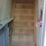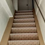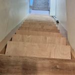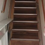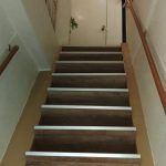 自由が丘店舗階段工事です。とても急で踏み面だ狭く危ないとのことで踏み面を少し広げてノンスリップをタイヤ式に変えてフロアータイルで仕上げました。